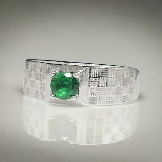 "Verdant Grid" Sterling Silver Ring with Emerald-Hue Center - Modern Textured Statement