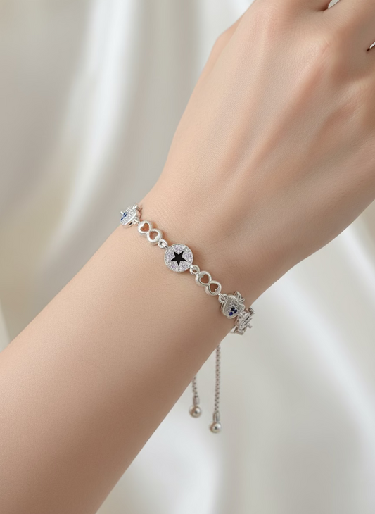 Sparkling CZ & Blue Sapphire-Style Bolo Bracelet - Adjustable Sterling Silver Tone