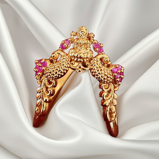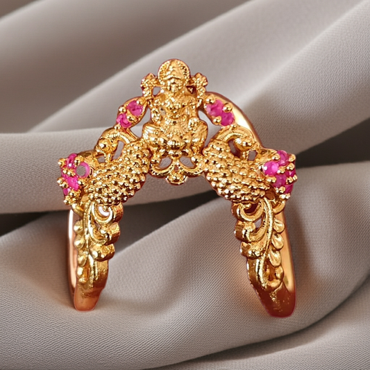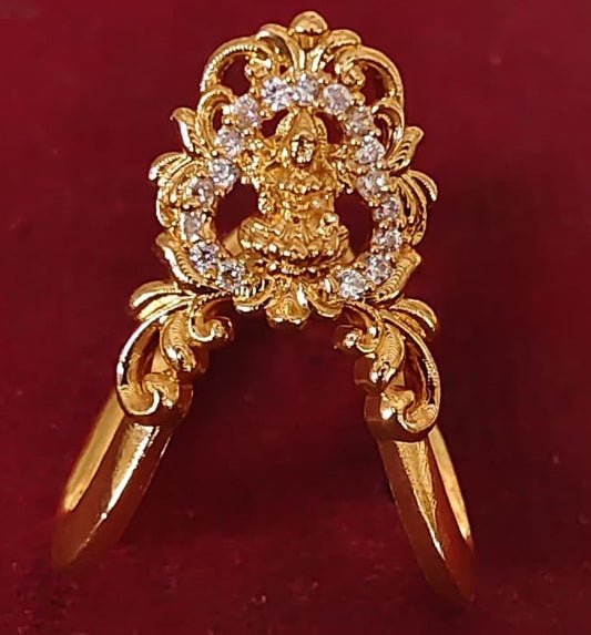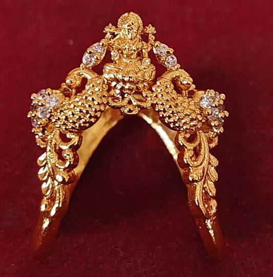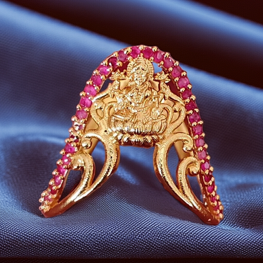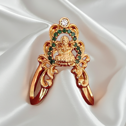 925 Silver Gold Plated Temple Ring with Goddess Lakshmi & CZ Stones