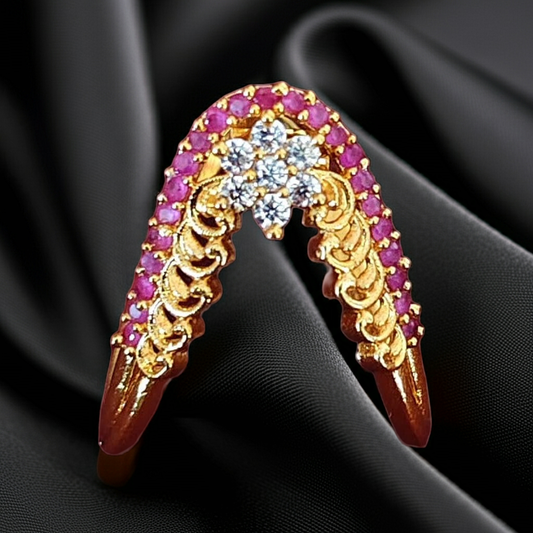 925 Silver Gold Plated Lakshmi & Twin Peacock Wedding Ring