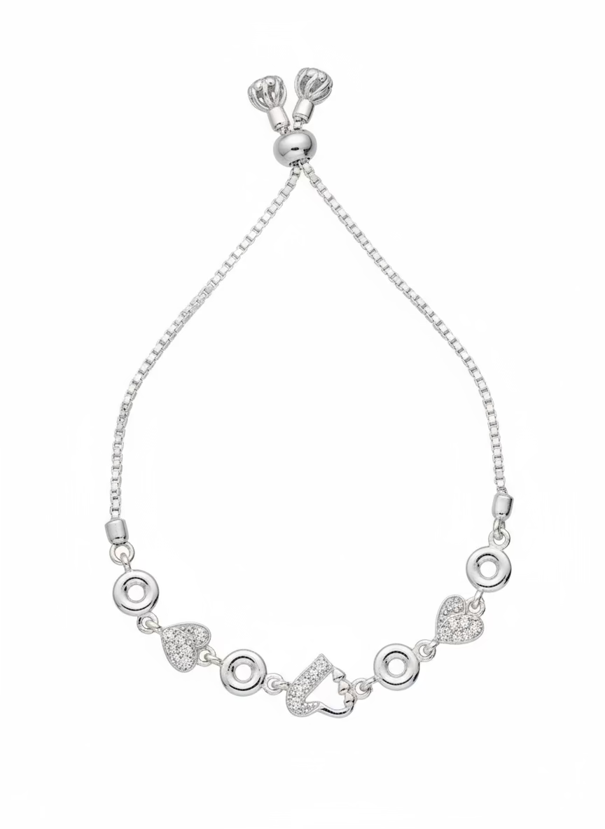 That's a lovely bracelet! It appears to be a silver-tone, adjustable slider bracelet featuring a mix of pave-set cubic zirconia (CZ) charms in various shapes, including hearts and what looks like a triangle or a different geometric shape.
