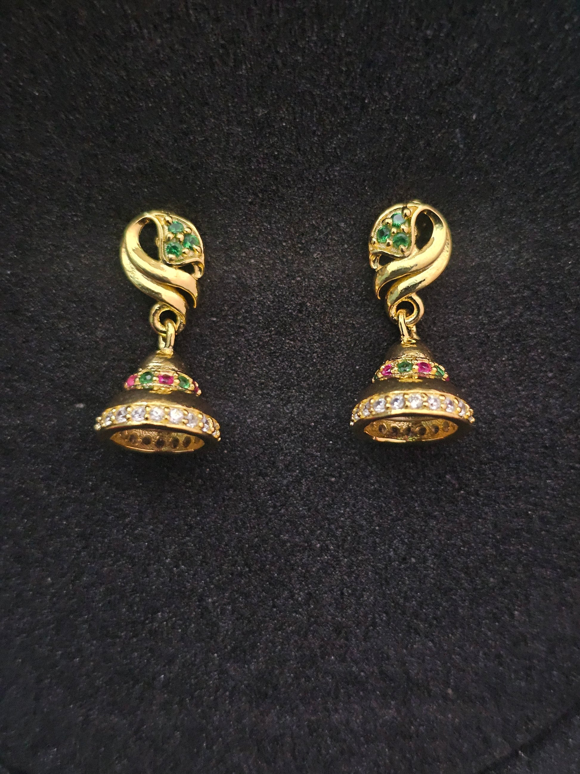 Embrace timeless elegance with these beautiful gold-tone jhumka earrings. Featuring a classic bell-shaped design, these earrings are adorned with sparkling white stones and vibrant accents of green and ruby-colored gems. Perfect for adding a touch of traditional charm to any outfit.