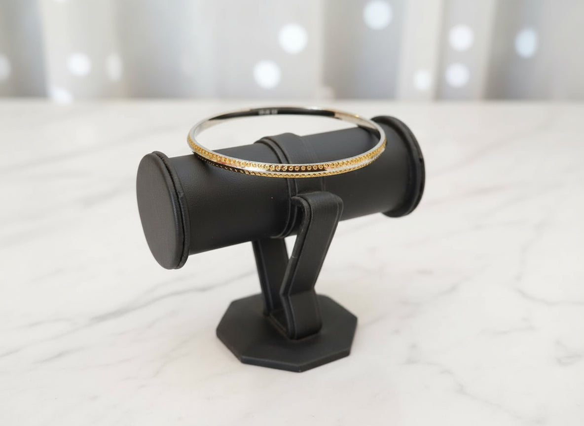 • Display: Note: The image shows the bracelet displayed on a standard black velvet/leatherette jewelry stand, which is typically not included with the purchase of the bracelet itself.