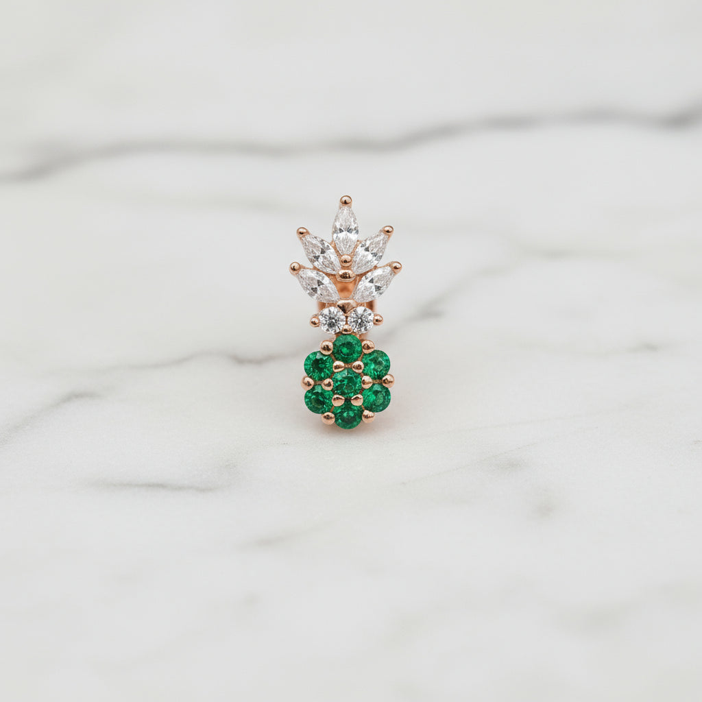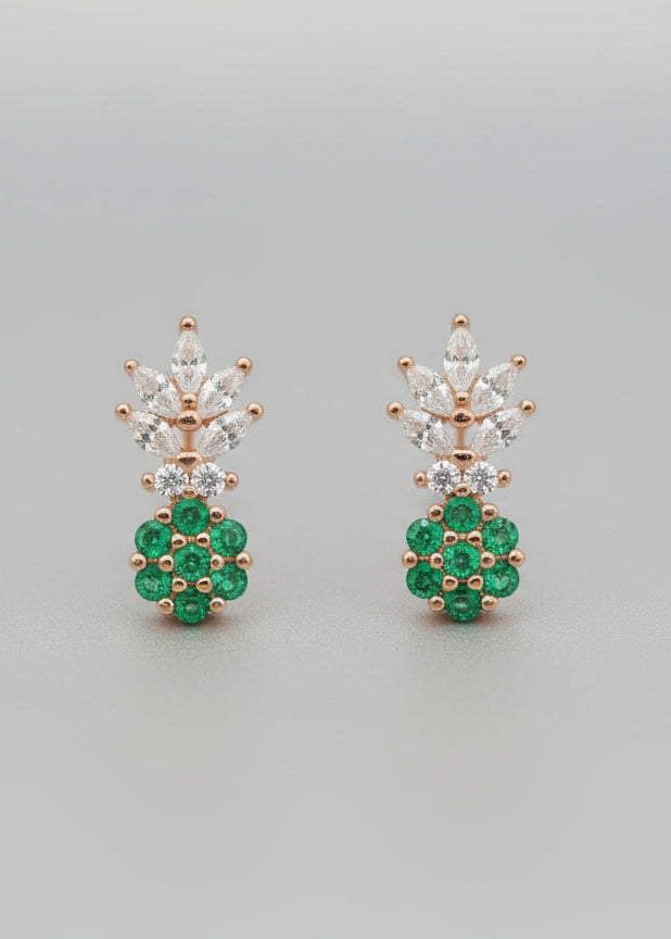 The centerpiece is a delightful miniature pineapple pendant. The body of the pineapple is set with clear micro-pave stones, while the crown of the fruit is highlighted with a striking small, emerald-cut (or similarly shaped) green gemstone, giving it a beautiful pop of color and a luxurious finish.