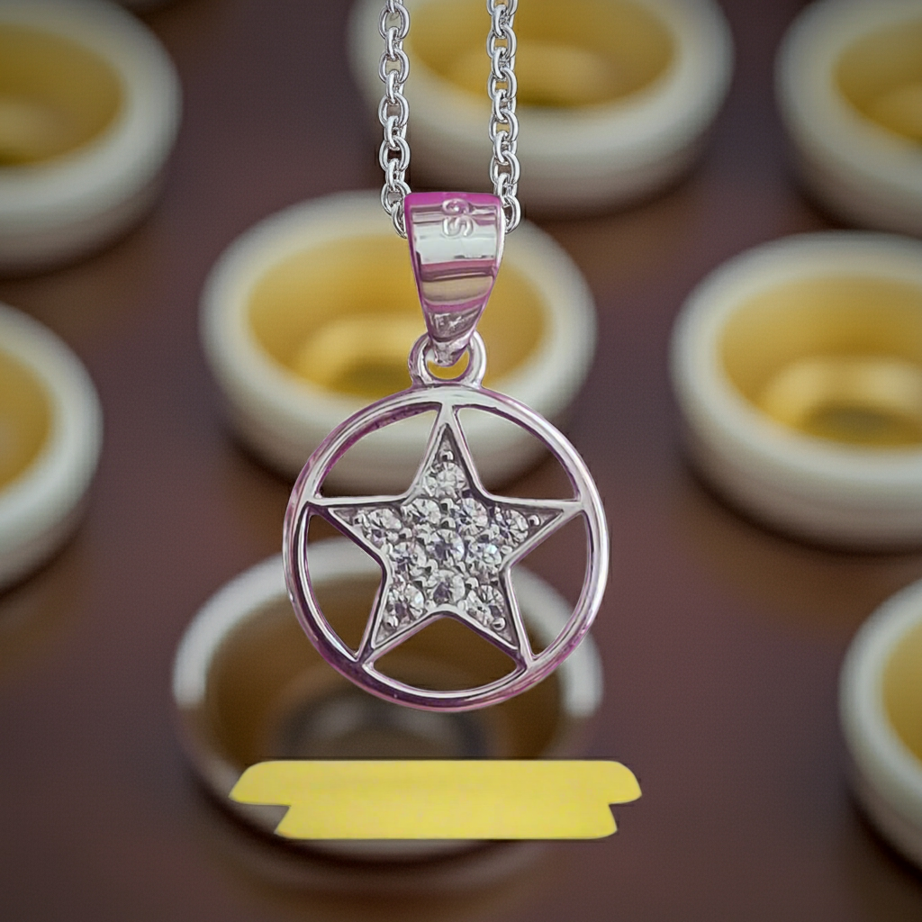 Shine bright with our 92.5 Pure Silver Fancy Star Symbol Locket, a dazzling accessory that symbolizes hope, guidance, and brilliance. Perfect for adding a touch of elegance to your everyday or special occasion outfits.