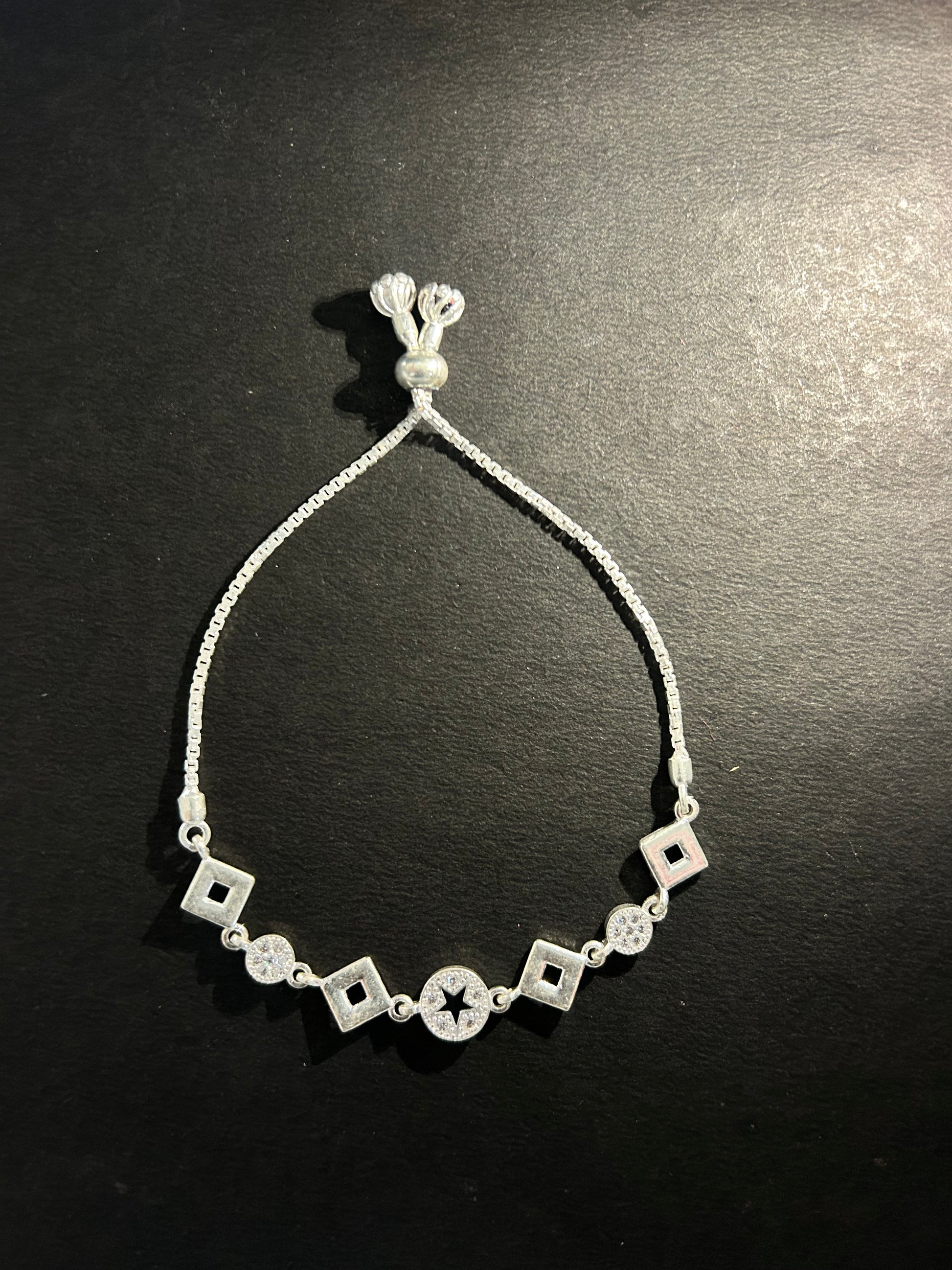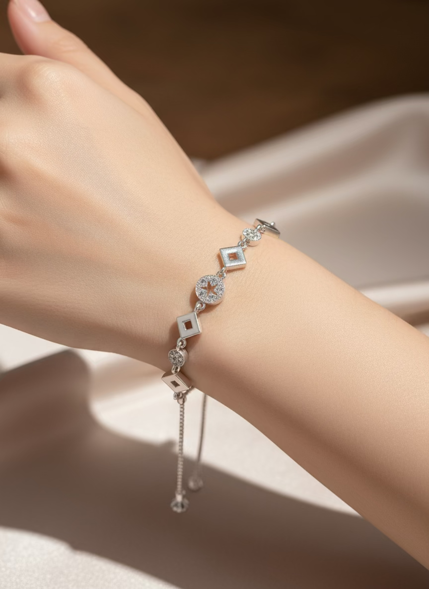 - Design: The bracelet showcases an alternating pattern of rhombus (diamond-shaped) charms and sparkling round-cut CZ stones. The center charm is a distinctive star design encrusted with smaller CZ stones, creating an eye-catching focal point.